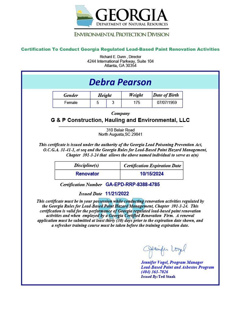 G & P Construction, Hauling and Environmental, LLC, is a North Augusta, SC-based construction company, proudly owned and operated by Debra Pearson, a trailblazing Black woman entrepreneur. Specializing in a wide array of services, the company offers EPA RRP contracting, lead inspection and risk assessment, demolition, land clearing, and grubbing. Their focus is on delivering top-tier service while adhering to the highest standards of safety and environmental responsibility.